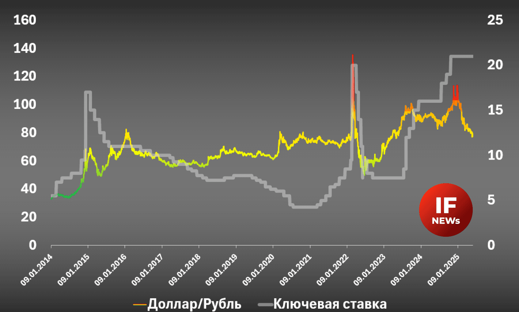 Наш ответ – нет. И это только подтверждает уникальность ситуации 2025. В обоих случаях [в 2015 и 2022 году] причины изначального роста курса были геополитическими. В 2024, кстати, пик был достигнут после введения санкций Штатами против очередных 50 банков РФ. Но последующее резкое укрепление было в рамках экономических законов и являлось помимо прочих факторов (таких как проблемы с внешней торговлей и низкие объемы торгов рублем на бирже) реакцией на резкие скачки ставки ЦБ. Ее увеличение совпадало с последующим укреплением рубля. А снижение, что особенно видно в 2021 году, приводило к ослаблению национальной валюты.