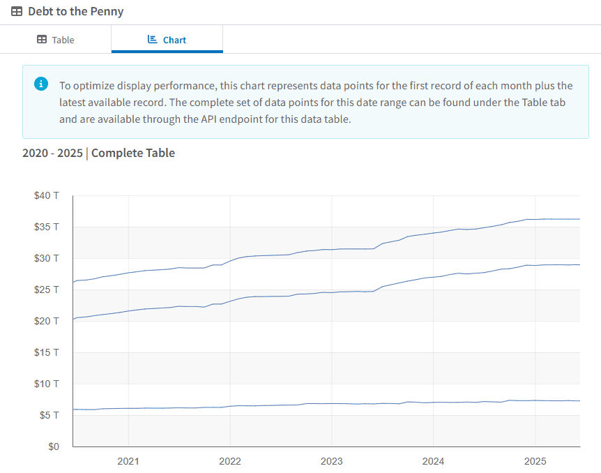К середине июня госдолг успел подрасти ещё на сотни миллиардов: официальный счётчик Debt to the Penny показывает $36,21 трлн. Если смотреть только на рыночную часть («debt held by the public»), показатель держится вблизи $26 трлн, а отношение к ВВП уже перевалило за 130 %.
