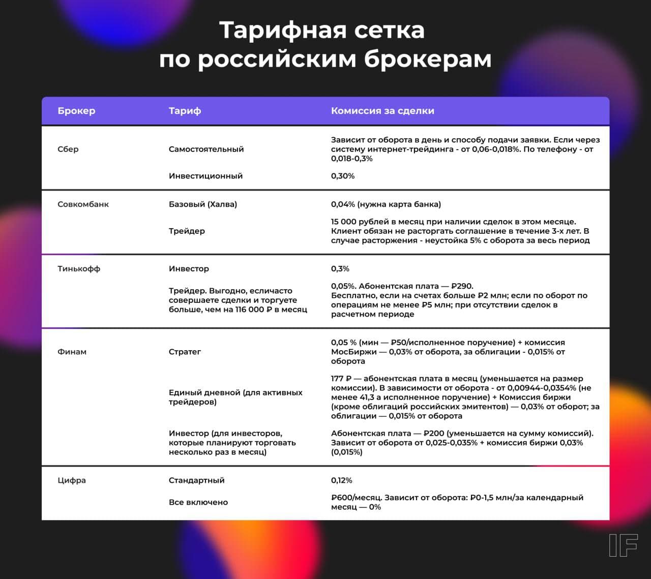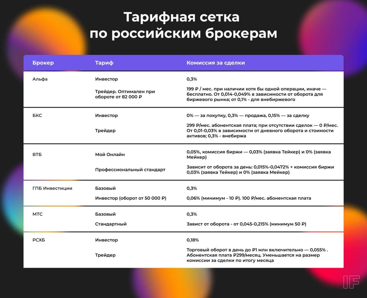 Мы собрали для вас тарифные сетки по основным российским брокерам, чтобы вы могли наглядно сравнить условия.