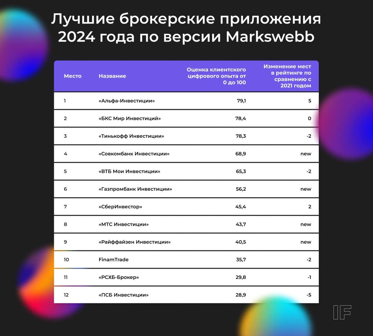 Вот как выглядел топ-12 в 2024 году — хороший ориентир, чтобы понимать, кто из брокеров больше всего вкладывается в цифровой комфорт своих клиентов.