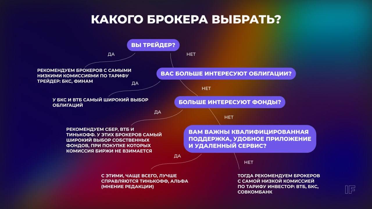 Как видите, всё зависит от вашей стратегии. Если вы активный трейдер, вам нужны минимальные комиссии за сделку. Если интересуетесь облигациями — важен их широкий выбор. А если вы долгосрочный инвестор, которому важны удобство и сервис, — на первый план выходят качество приложения и поддержка.