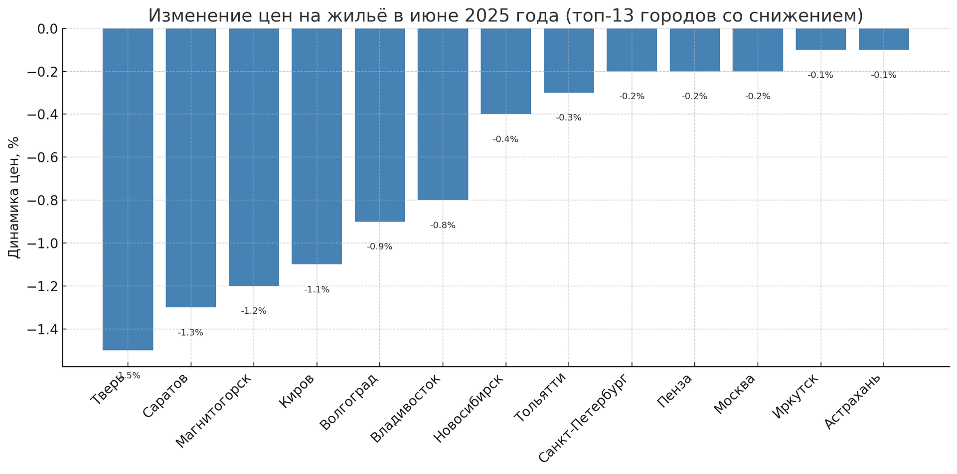 Впервые с начала года рынок вторичной недвижимости показал массовое снижение цен. В июне 2025 года падение зафиксировано сразу в 13 крупных городах России — для сравнения, в мае такая динамика наблюдалась только в одном. Об этом сообщают аналитики компании SRG.